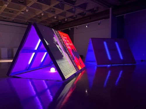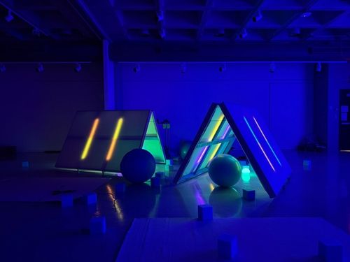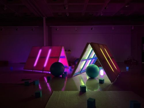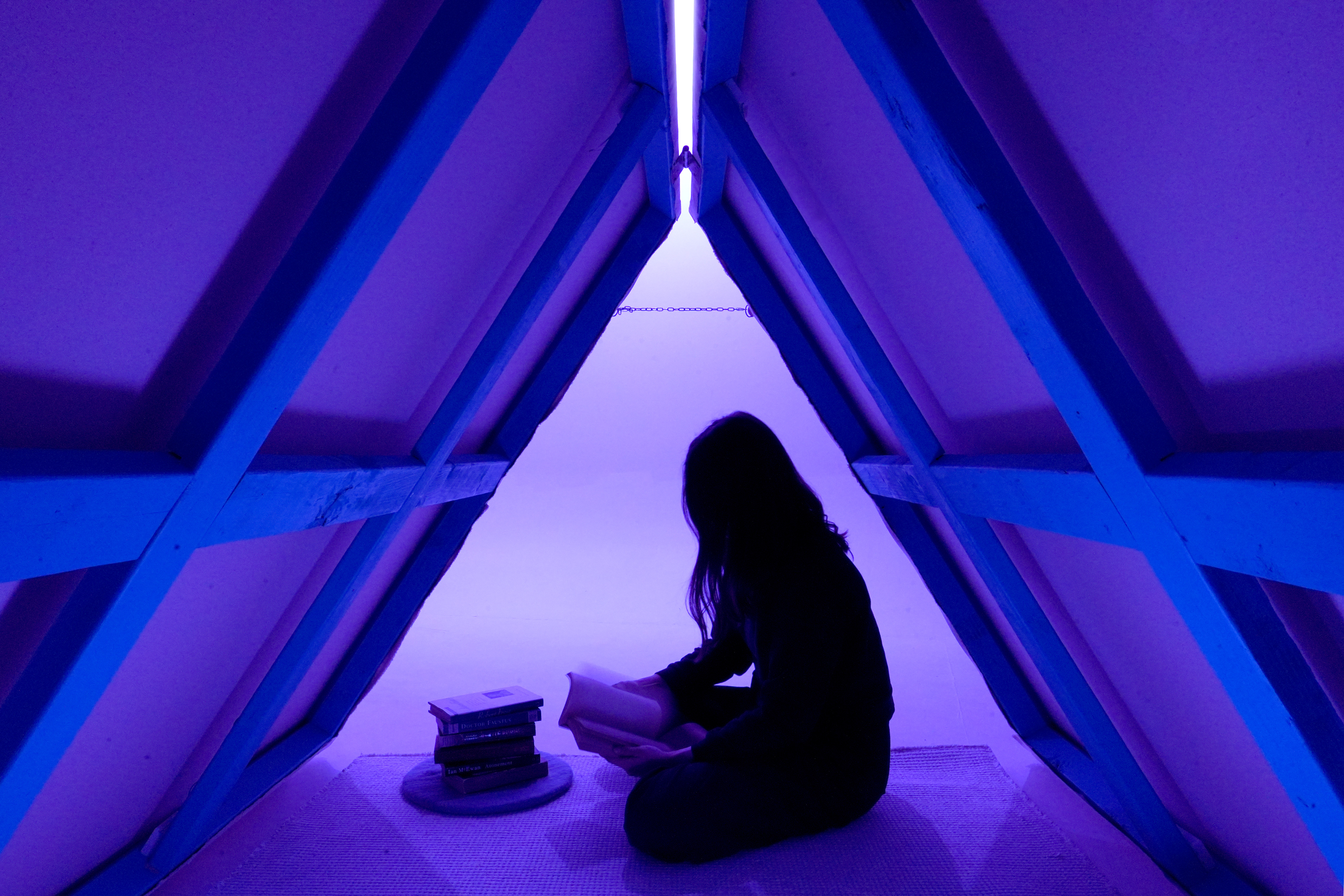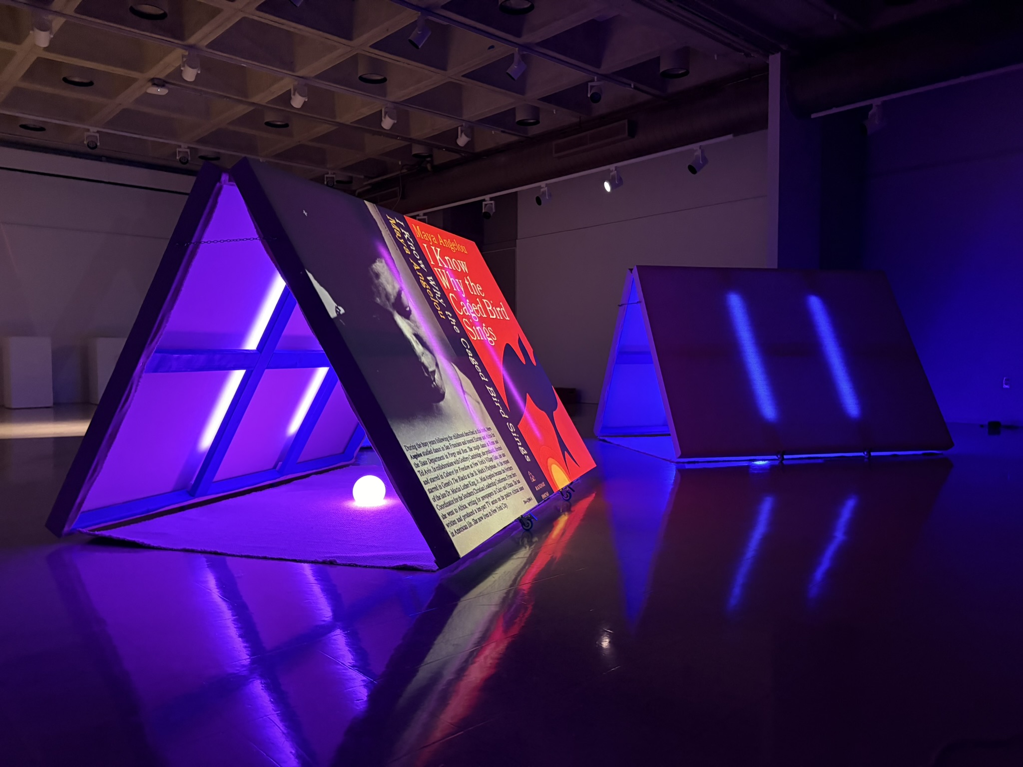ZA (Zuroweste Architecture) was invited by WAI Architecture Think Tank (Nathalie Frankowski and Cruz Garcia) to participate in their Fall 2025 exhibition A Classroom in the Future. ZA’s contribution, “A Traveling Sanctuary for Reading Banned Books,” takes its form from the structure of a book: a front and back cover connected by a spine. Built as 5’ x 7’ large-scale canvas stretchers, each leaf is connected by stainless steel door hinges that allow the sanctuaries to open and close like a book. Attached to each leaf are two steel casters, allowing the sanctuaries to travel freely and become nomadic. The three sancturies can be arranged: 1) spine-to-the-ceiling to create reading tents (steel chains are provided to incrementally modify opening angles, prevent lateral thrusting, and ensure structural saftey); or, 2) spine-to-the-wall to create wall partitions. Following the exhibition, the canvas stretchers will be demounted and given to local artists to paint on. LEDs controlled by are included, allowing readers to choose their favorite color light to read with. Rectangle carpets, inflatable spheres, foam cubes, and plants provide additional elements of comfort and play.