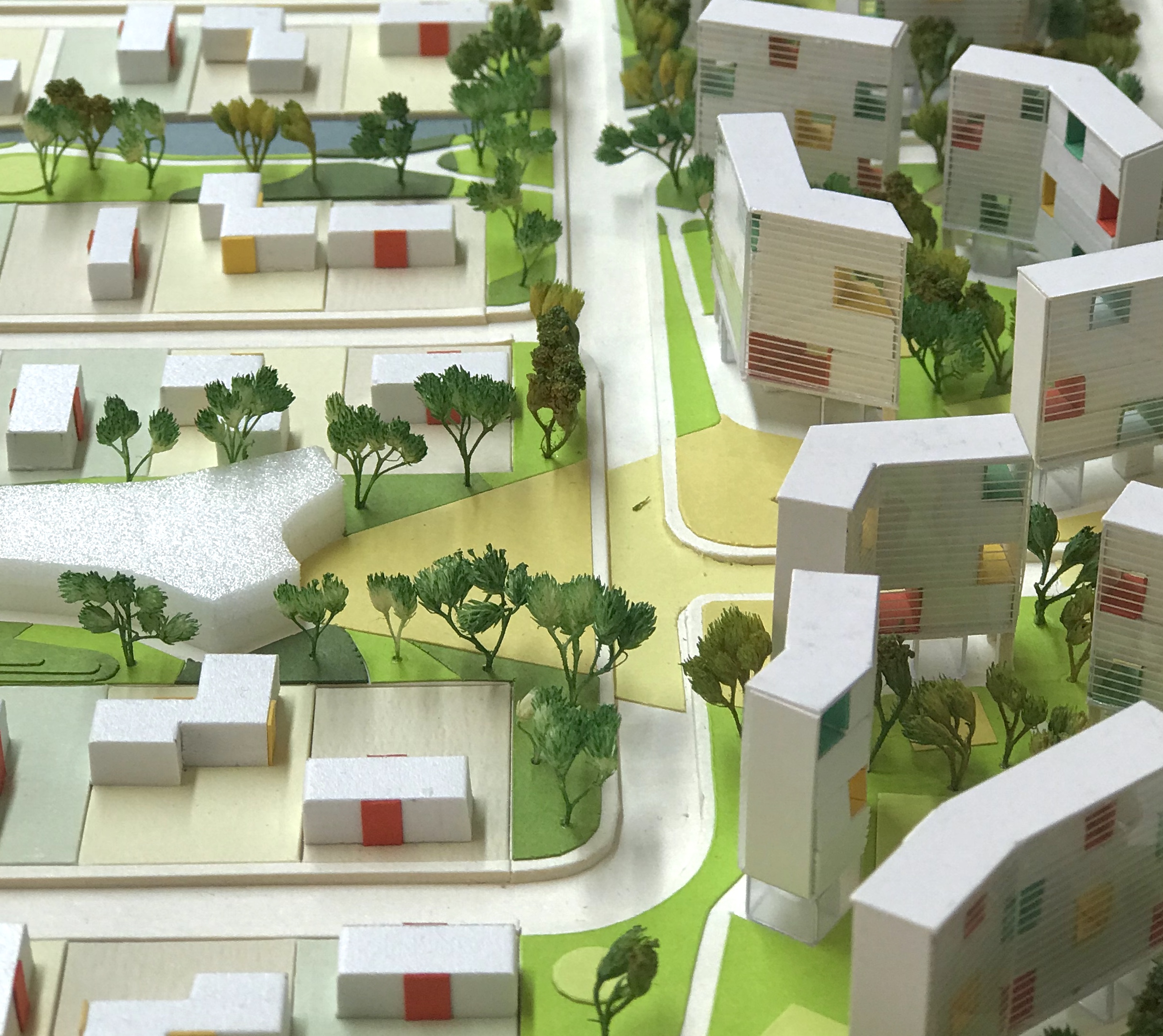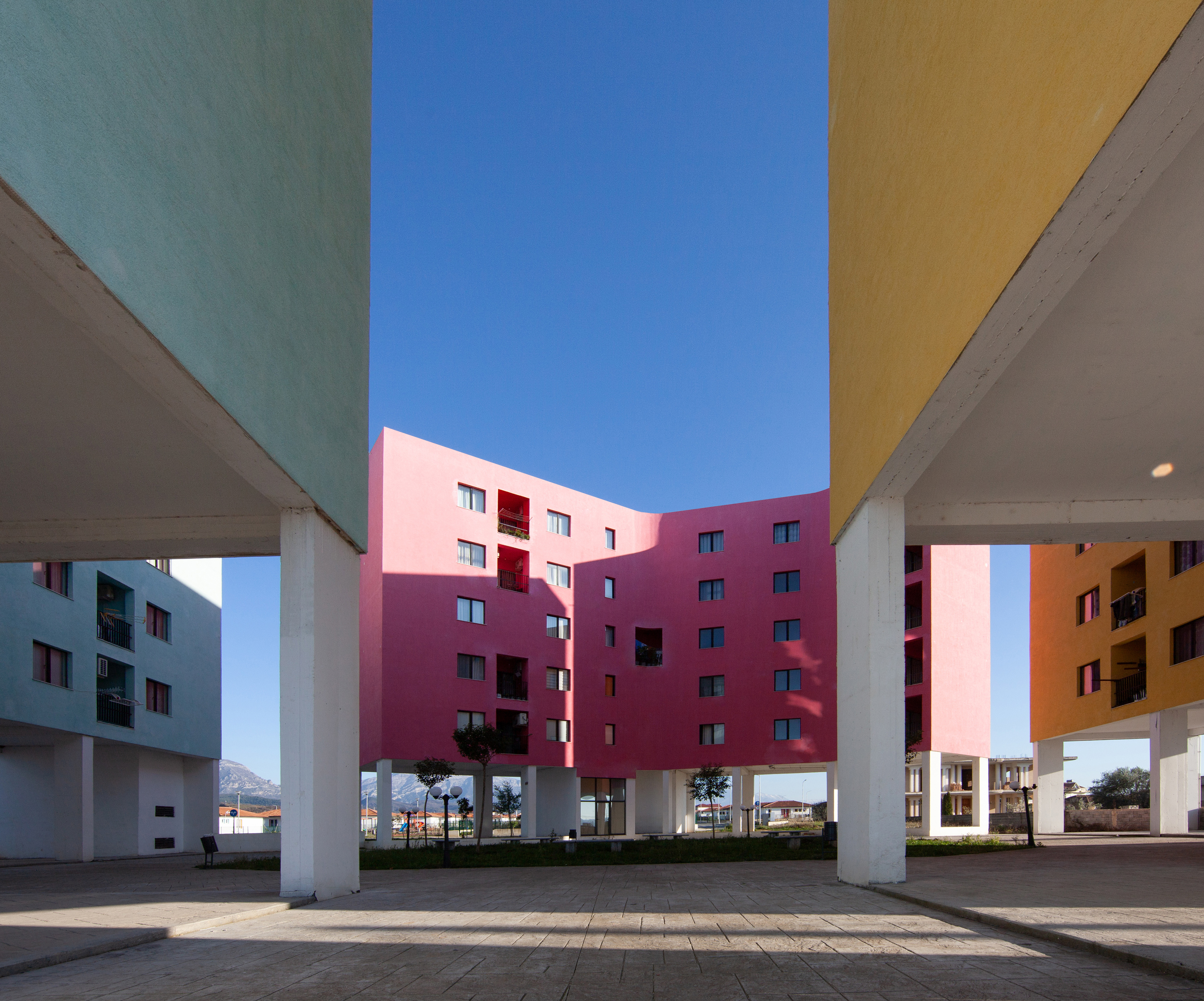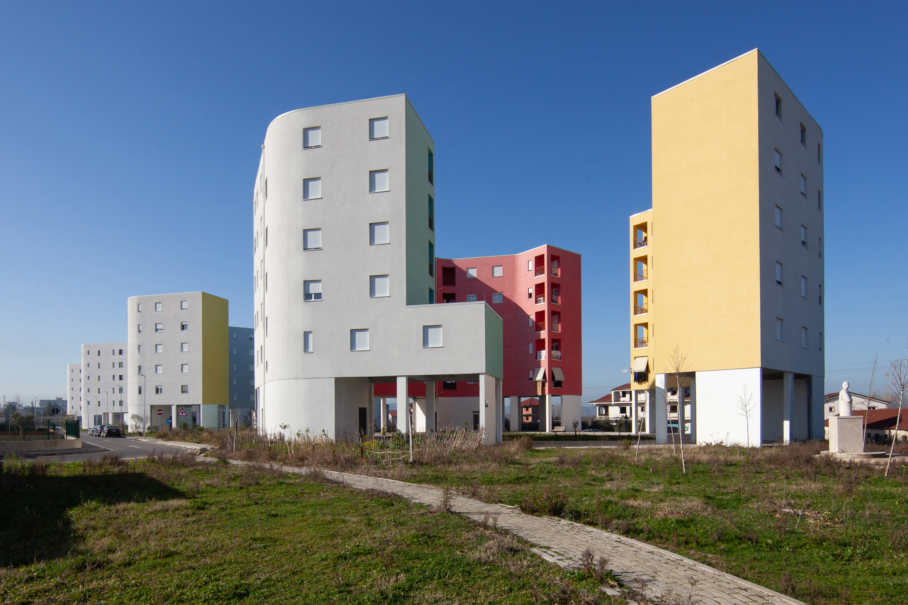 Developed is response to Albania’s devastating November 2019 earthquake - which left 51 dead, 3,000 hospitalized, and 32,000 homeless - ZA worked with the National Territorial Planning Agency of Albania, the Albanian Development Fund, and the Office of the Prime Minister Edi Rama to design a 1,200-resident, 24 acre postdisaster masterplan featuring a combined 200,000sf of residential, educational, institutional, commercial, and community-based programs. 15 multi-family buildings flow along the western edge of the site, providing homes to 93 displaced families on formerly agricultural land. These buildings are radically thin in section; single-loaded corridors provide access a mix of one, two, and three bedroom units. Every room in these units is the full width of the building, bathed in light from two sides and naturally cross-ventilated by Albania’s mild air. Each unit has a 300sf terrace, open on two sides to the surrounding environment, providing residents with the psycho-social benefits of indoor/outdoor Mediterranean living. The multi-family buildings wiggle and bends in concert with strategically positioned trees to provide an experience of living in the canopy. The ground floor of these multi-family buildings are left open to evolve in a flexible way as the community grows and self-organizes patterns of social exchange and ritual. These activities will unfold along a horizontal ground plane, a visually continuous pastoral datum navigated by paths linking landscape events such as gardens, plazas, and recreational fields. East of the multi-family strip, an intimate 120-house neighborhood consisting of one, two, and three bedroom homes extends towards the horizon along “green fingers,” linear parks which weave together wild nature, cultivated landscapes, pavilions, kindergartens, and nurseries.