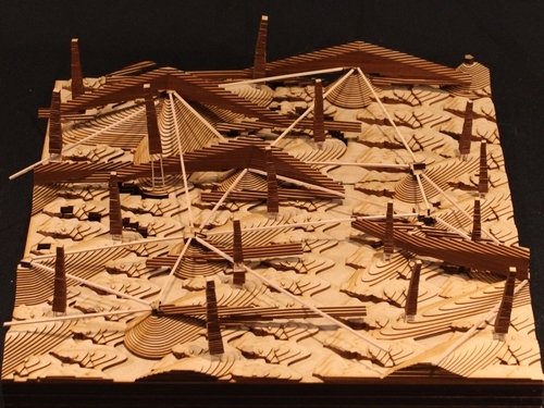 The disaster sequence simulates the construction of the city, in general steps, starting from the footprints that left the displacement and destruction of the buildings, after the tsunami disaster. It shows the city of Natori after the disaster of a supposed tsunami, and how from the remains of the destroyed constructions, the material is reused to create organisms in a gradual way. The sequence is shown in 3 parts, simulating a density of 50 dw/ha, then 100 dw/ha and finally 150 dw/ha, because of the use of material. This is decisive, since the post-disaster city uses the disaster to its advantage, being no longer a negative disaster. The post-disaster city craves the arrival of tsunamis in order to continue growing and being productive. It is a non ending productive loop. Starting with the most hierarchical, the air or “disaster” organism is generated, with parallel direction as from the water, from the bottom up, then the creation of the earth organism, generating both new topographies. From this, water organisms are generated, both ocean water collectors as well as rainfall, allowing to provide water to the buildings that are generated later, the fire organisms. At the same time it will simulate the different water tides that occur in the site, low, high and tsunami tide, which had a maximum height in the case of the Tsunami disaster in 2010 of 8 m. Each of them create different conditions in the city, each of them productive in different ways, but never interrupting the city activities.