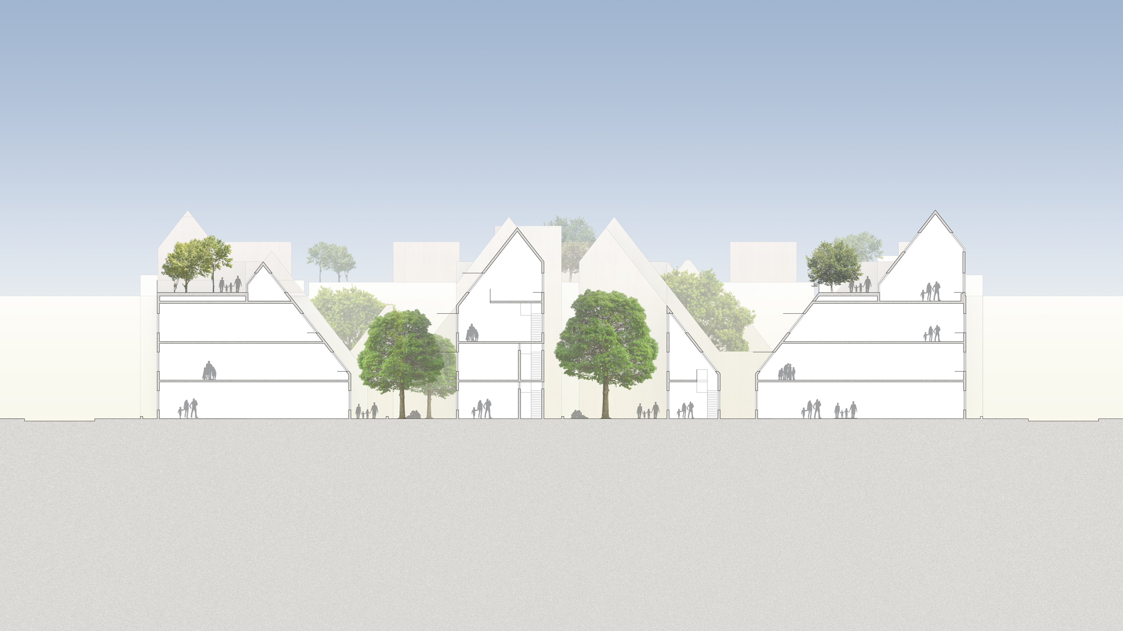 All new buildings, both in the garden and above the existing buildings, are distributed in a checker board pattern. The spaces in between them are utilized as green space (pleasure gardens, playgrounds, vegetable gardens, etc) which carry light and air through the neighborhood. Typologies are sculpted using a sky exposure envelope generated using an angle of 52 degrees, this provides 20 foot-candles to all of the units 85% of the year (9am - 5pm).