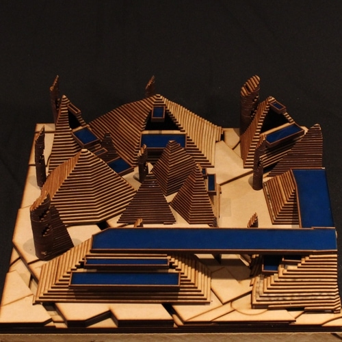The organisms within the site work together once they are combined. These combinations are formed in parts. In the first step the fire pyramids are adapted to the earth channels forming new pyramids, also all of the same height. Then, these pyramids are related to the existing buildings in Pompeii today, where they adapt to the heights of the buildings, leaving room for them. The interior of these pyramids which were in contact with the amphitheaters of earth are transformed into a stepped interior adapted to the shape of the base of the pyramid. Then arise the rainwater basins, which are located at the top of the pyramids, which are cut according to the size of the basin, to benefit the capture of water. The pyramids that are joined by the basins are the cases where the biggest flows of water were on the street, and in this way it is captured. On the other hand are the thermal pools, which are also found in certain sectors of the site, these are distributed at two different heights of the pyramid and inside forming a cascade, leaving the zero level free. Then the air organisms form part of the water, opening a face between the cantilevered basins, leaving room for the cascade.