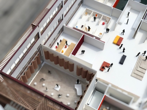 The Porch contains community-facing spaces such as a second gallery for the College’s Museum of Fine Art, a dance performance studio, a high-tech digital black box theatre and a small café/retail outlet that faces a public plaza.